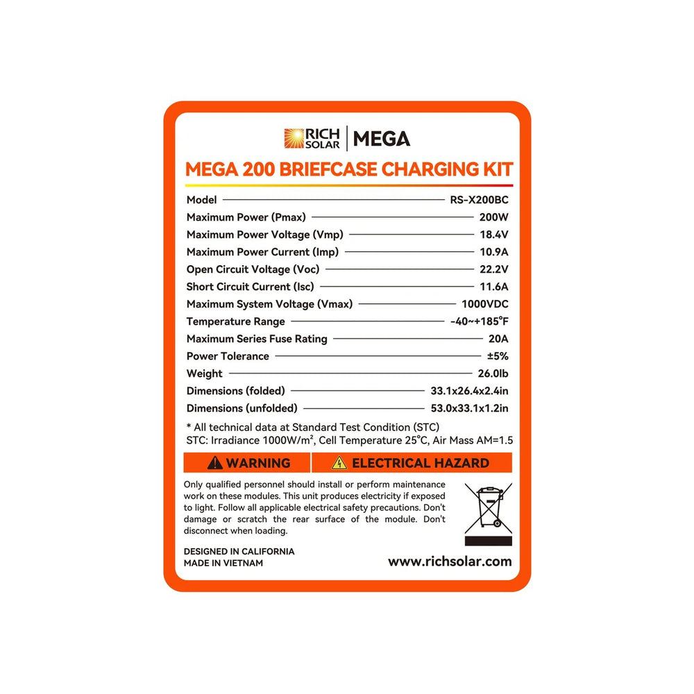 The Rich Solar MEGA 200 Watt Briefcase Portable Solar Charging Kit redefines portable solar power with its high-efficiency monocrystalline solar panel, robust construction, and user-friendly design. Its lightweight yet durable build ensures maximum convenience without compromising on performance. Weighing just 26 pounds and with compact dimensions when folded (33.1 x 26.4 x 2.4 inches), it’s easy to carry, set up, and store. When unfolded for use, the panel expands to an impressive size (53.0 x 33.1 x 1.2 inches), capturing ample sunlight to power your essentials.